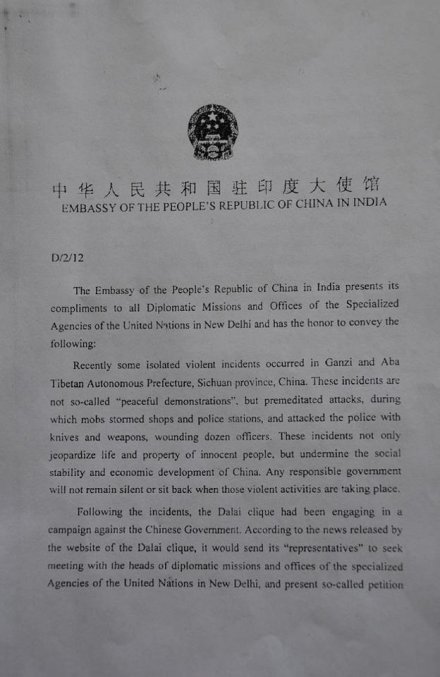 "L’Ambassade de la République populaire de Chine souhaite sincèrement que les missions diplomatiques et les bureaux des agences spécialisées de l’Organisation des Nations-unies à New Delhi ne reçoivent pas les soi-disant « représentants » de la clique du Dalaï Lama et s’abstiennent de tout contact avec eux, afin de ne pas envoyer un mauvais signal qui pourrait être utilisé abusivement par la clique du Dalaï Lama et provoquer un effet négatif sur les relations bilatérales", est-il écrit dans la lettre.